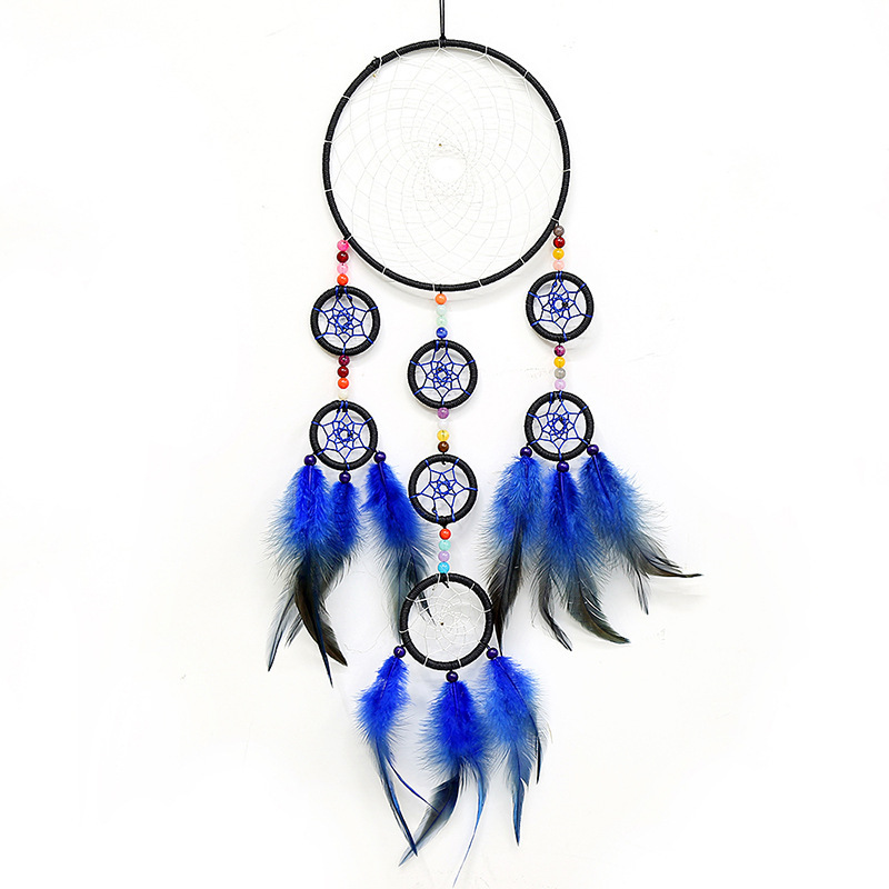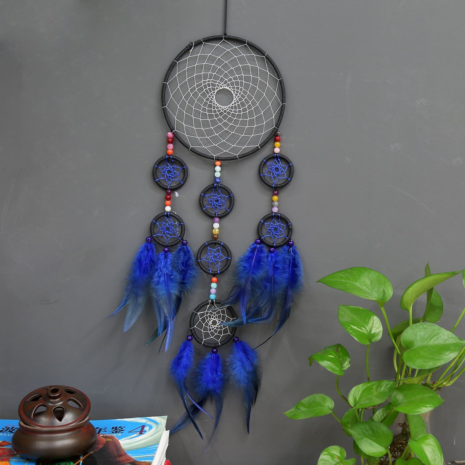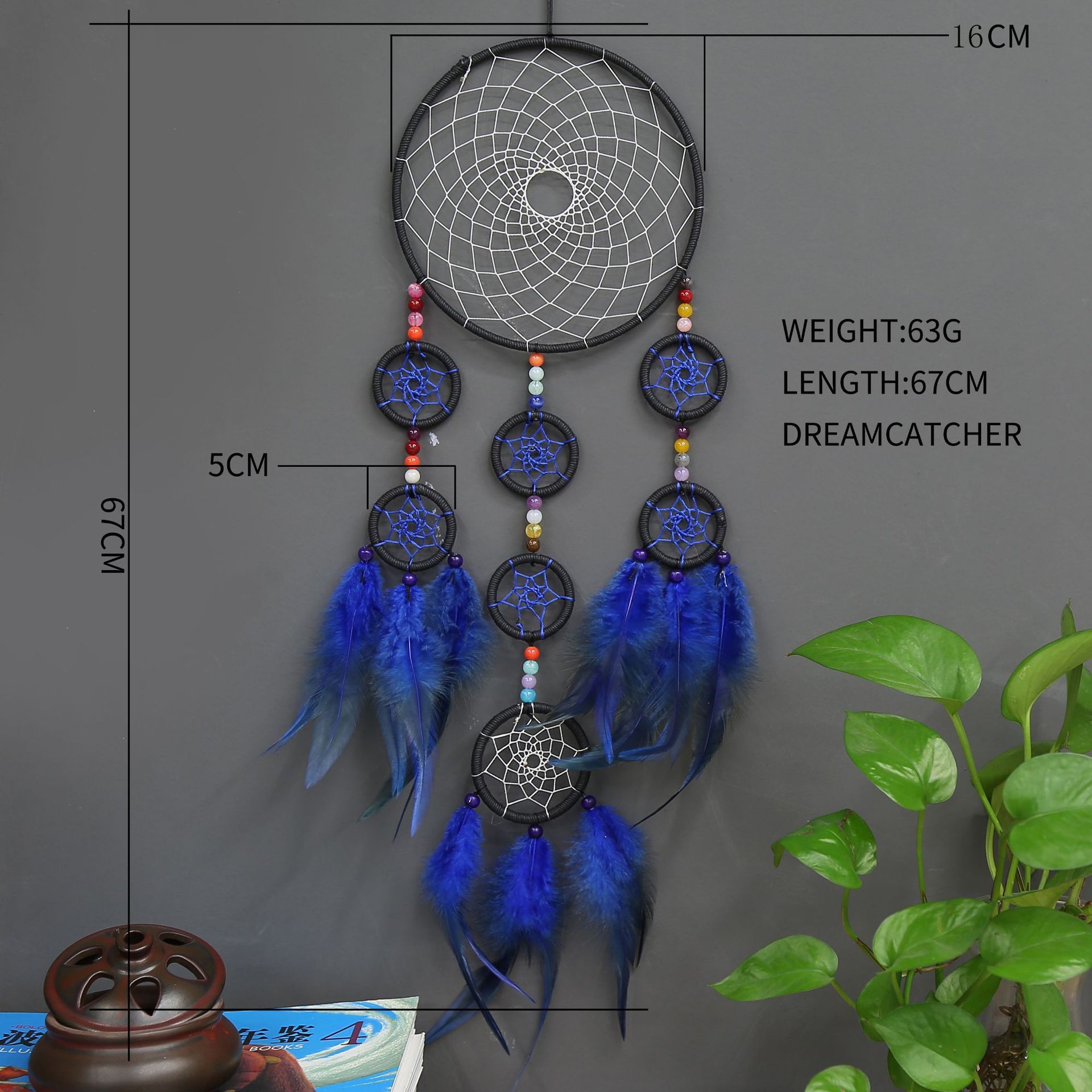Add a touch of elegance to your home with this stunning sapphire blue dreamcatcher wall hanging. Designed in a sophisticated European style, this decorative piece not only enhances your interior but also brings a sense of peace and charm. Made from high-quality iron, it features colorful beads and metal fumigation feathers that create a captivating visual statement. At 16 cm in diameter with a total length of 65-70 cm, it is the perfect size to hang in any living space.