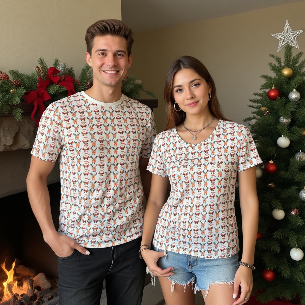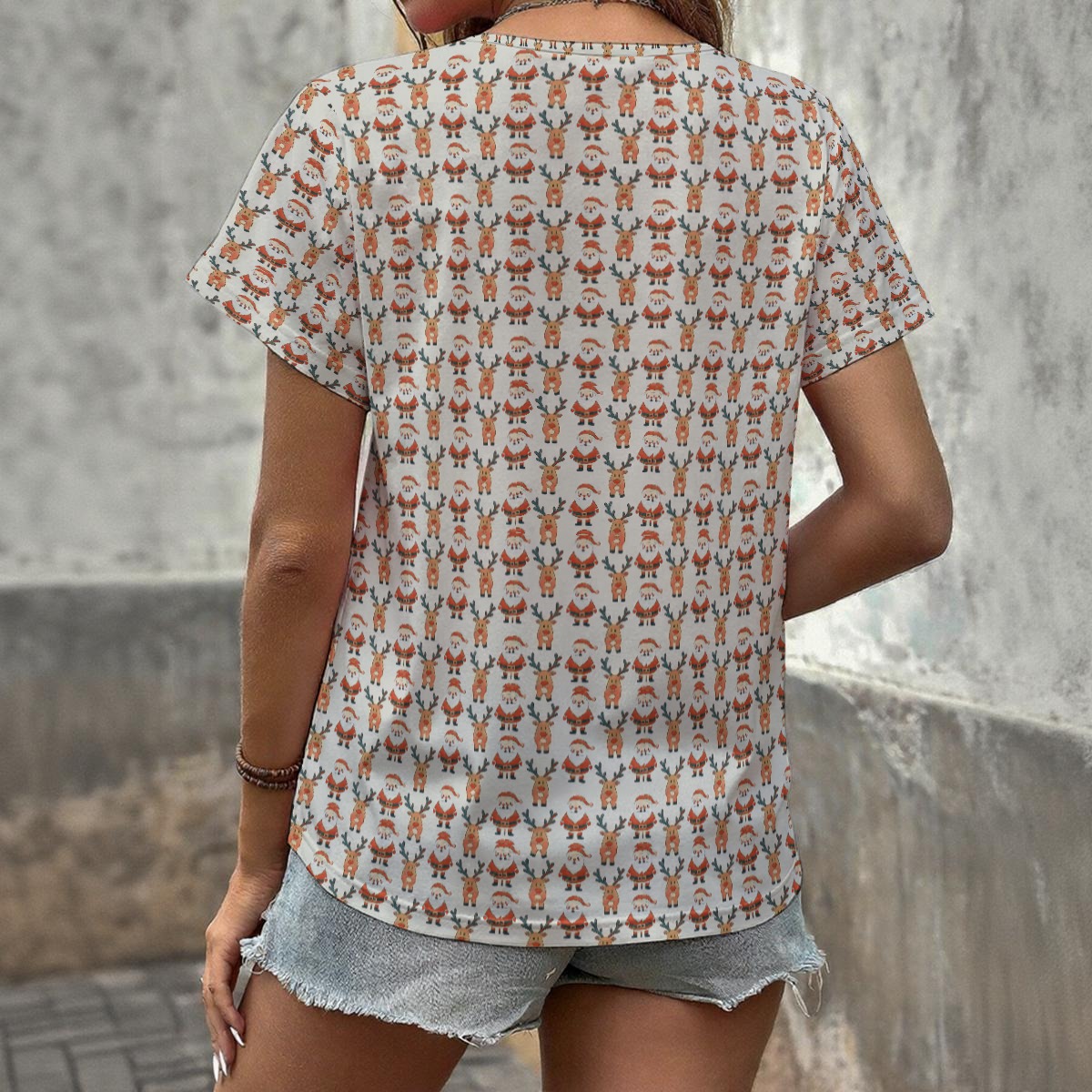 Add a festive yet stylish flair to your casual look with this Christmas-themed V-neck t-shirt. Featuring a repeating pattern of cheerful Santas and reindeer, this tee brings holiday spirit to your everyday style. Crafted from a soft cotton-blend fabric with a touch of stretch, it offers all-day comfort and easy movement. The playful V-neckline adds a subtle hint of charm, making it perfect for holiday outings, family gatherings, or just lounging in comfort. Pair it with jeans, shorts, or a skirt for a versatile summer or winter outfit that’s full of personality. This t-shirt is designed to be your go-to festive essential that blends fun and fashion seamlessly.