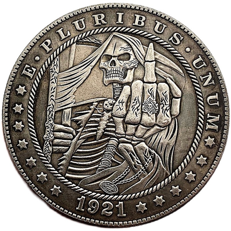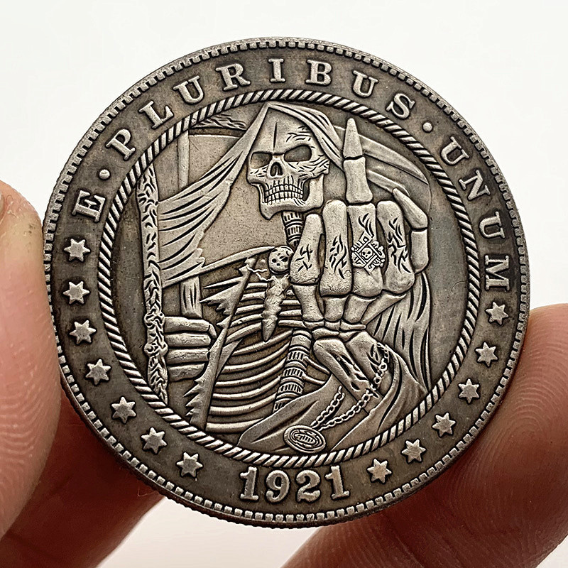 Add a striking piece to your collection with this 1921 Wandering Money Skull Finger commemorative medallion. Crafted from durable brass with an antique silver finish, it features a detailed skull design that gives it a unique, old-world character with a rebellious edge.