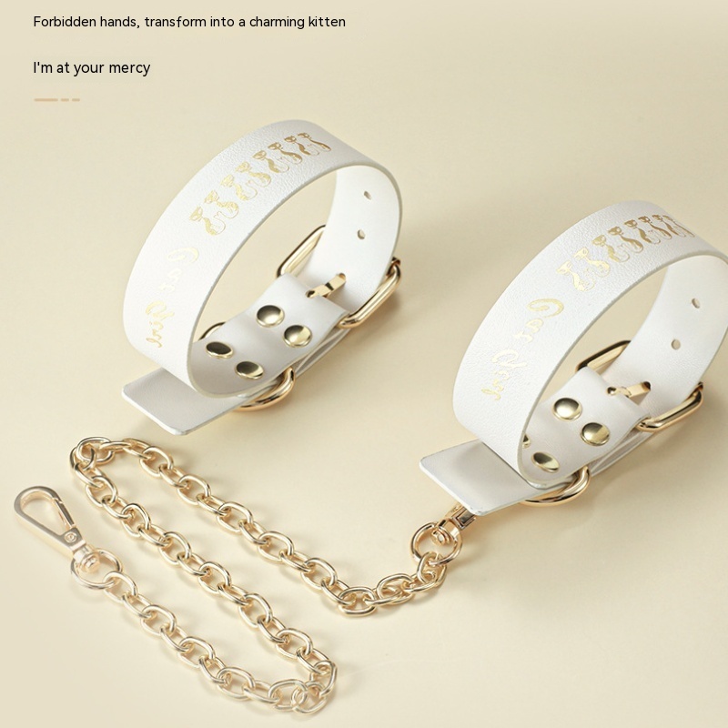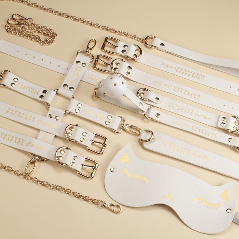 • Set includes handcuffs, ankle cuffs, ball gag, eye mask, collar, traction chain, cross buckle, and hand rackets