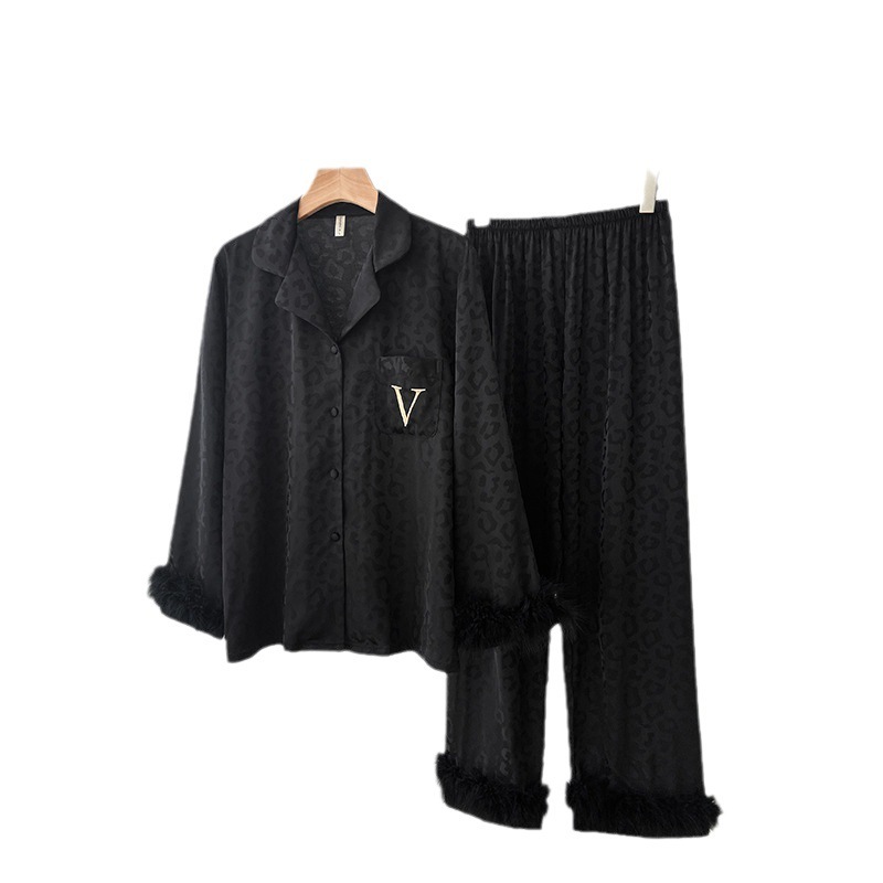 Women’s Leopard Print Long Sleeve Feather Ice Silk Pajamas Suit